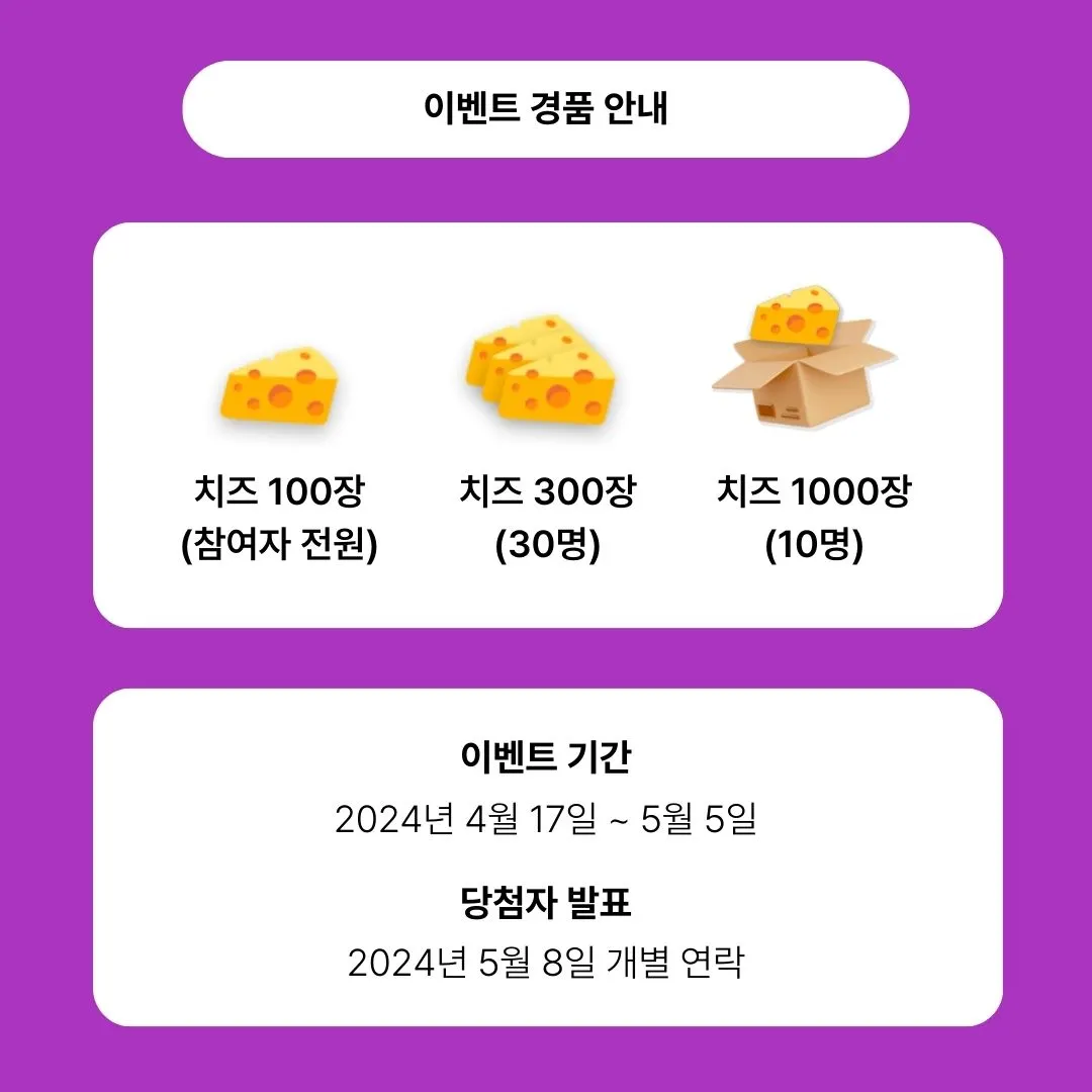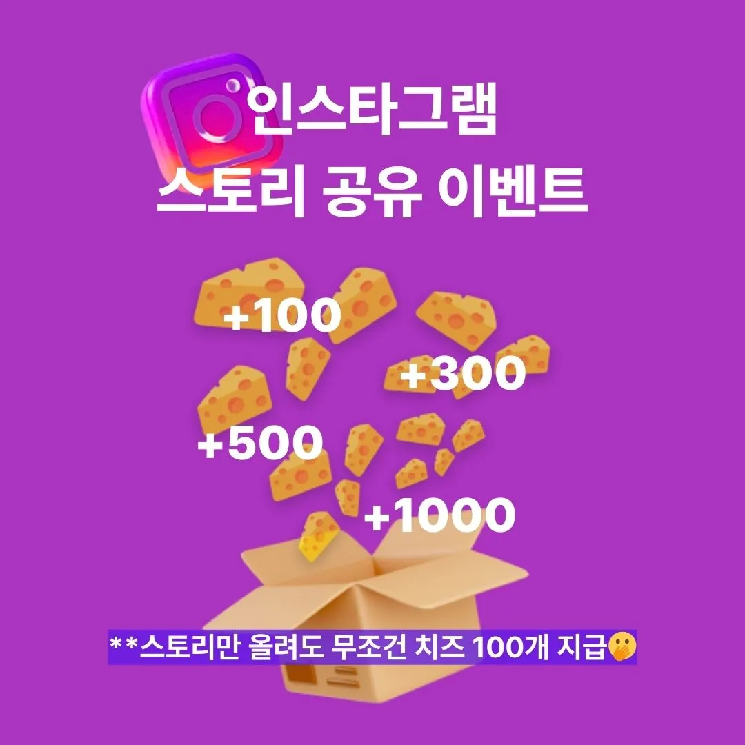 스토리에 게시물만 공유하시면 전원에게 치즈 100장, 추첨을 통해 치즈를 최대 1000장까지 선물로 드립니다
