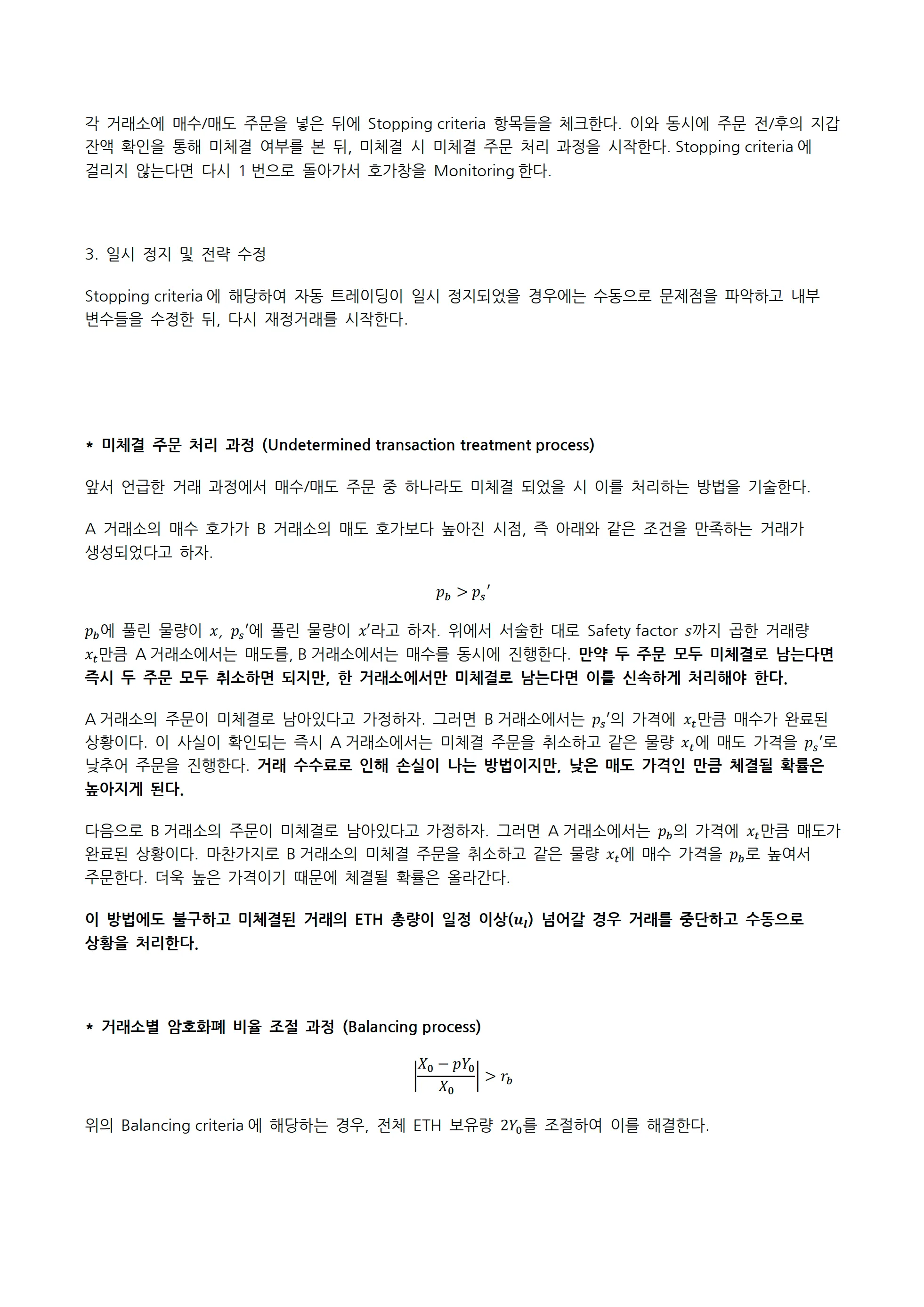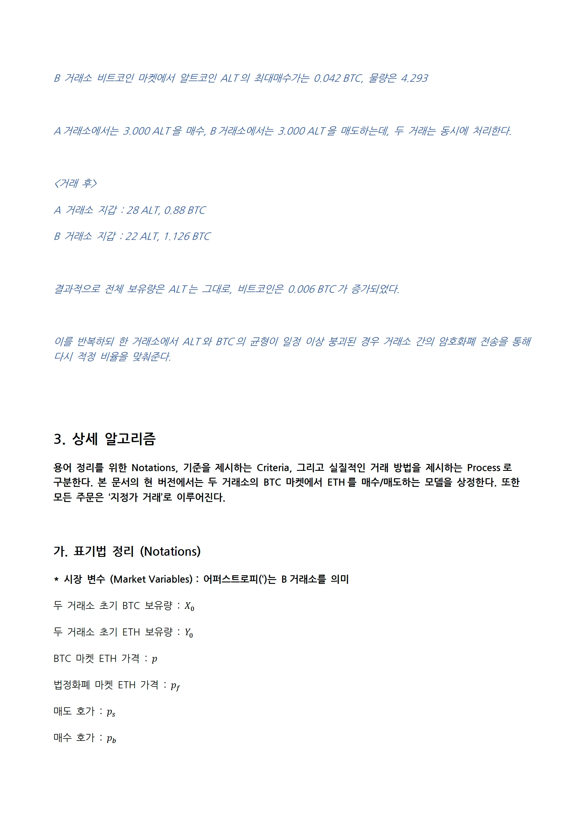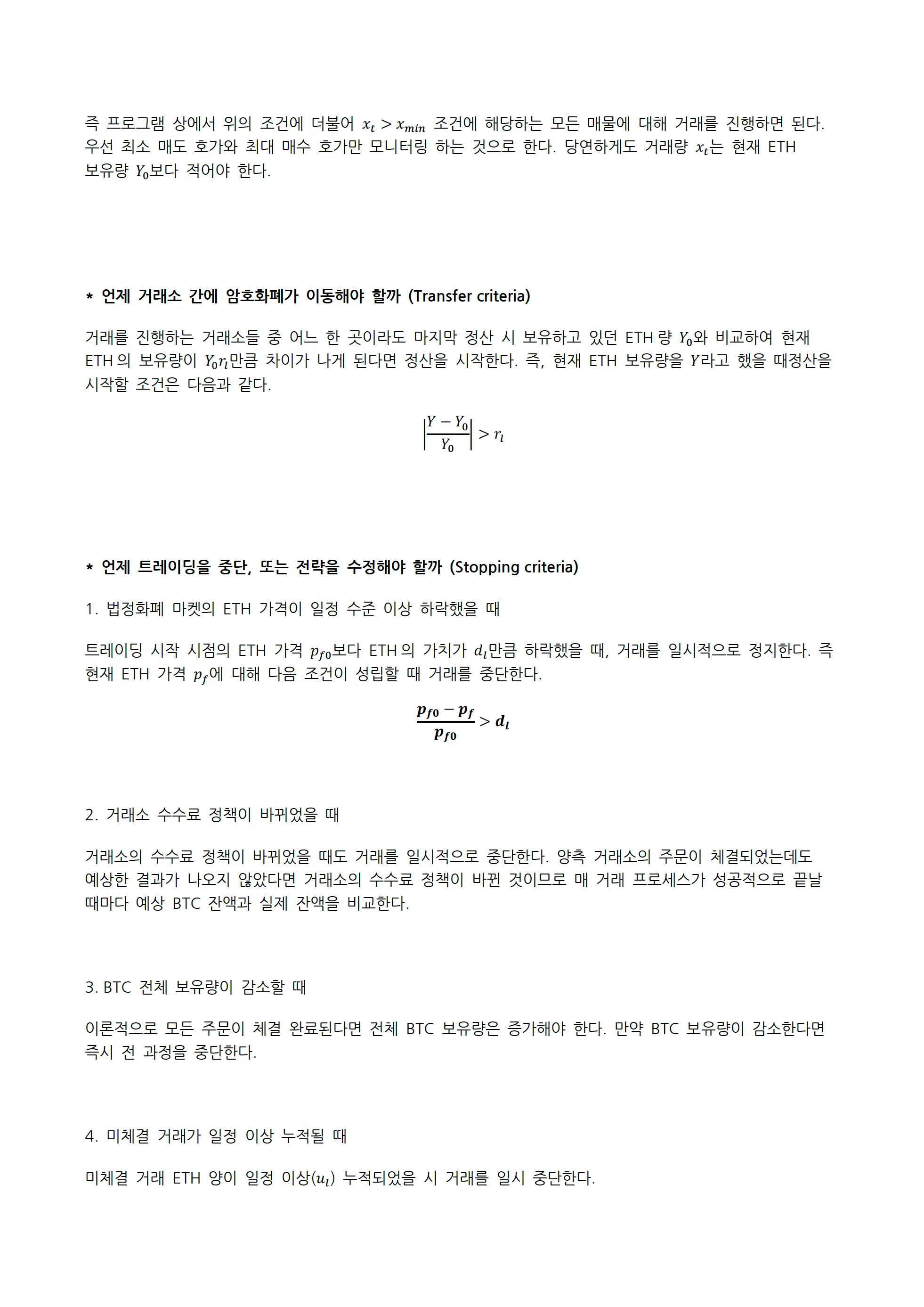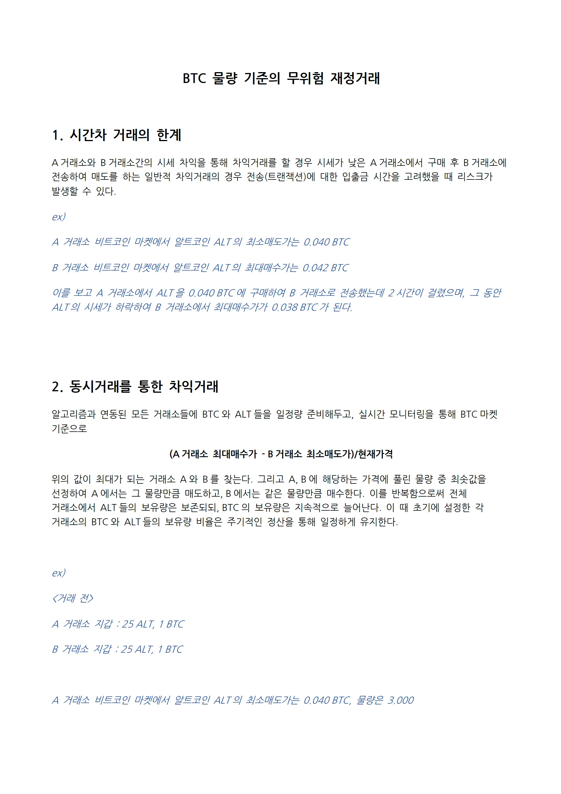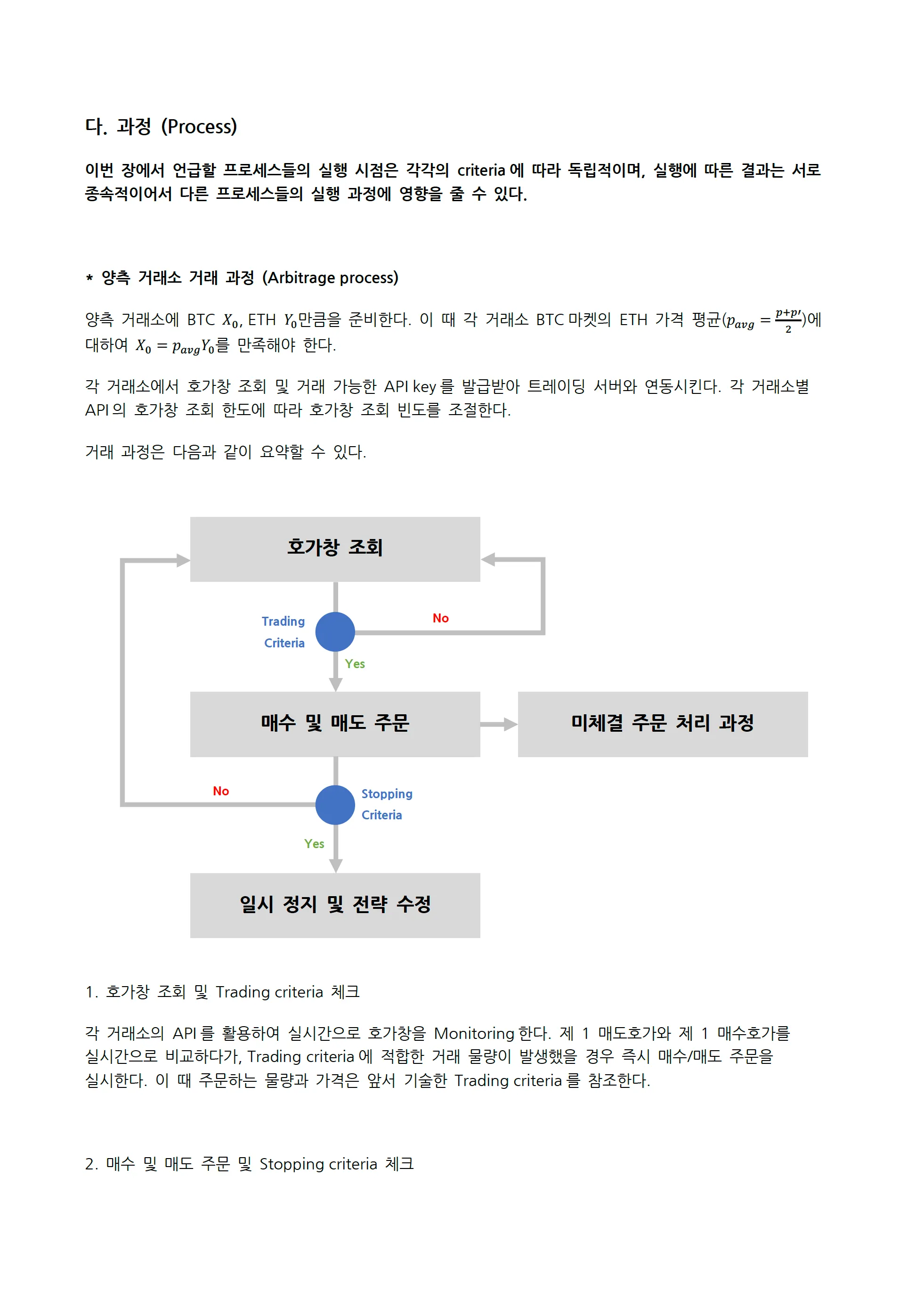 지정된 2개 이상의 암호화폐 거래소에서, 무위험으로 BTC 물량을 늘려가는 로직을 작성. 각 거래소의 수수료를 고려하여 언제 거래를 진행해야 하는지, 그리고 이때 수익은 얼마나 발생하는지를 수학적으로 분석했다. 이후 Node.js Express 서버와 암호화폐 라이브러리 ccxt를 활용하여 실제 코드로 작성, 거래 criteria를 만족하는 경우가 얼마나 빈번하게 발생하는지 실험을 진행했다.