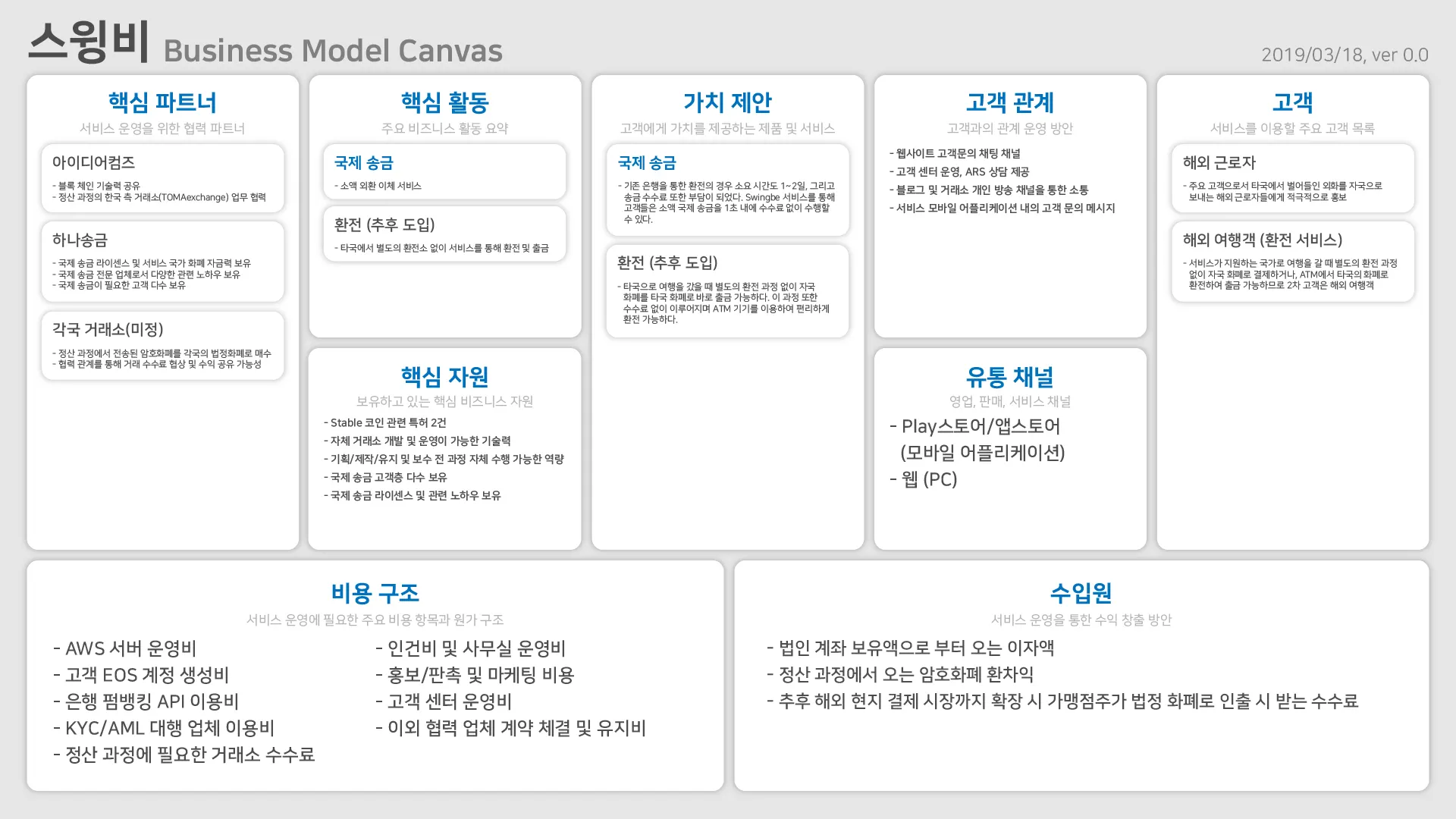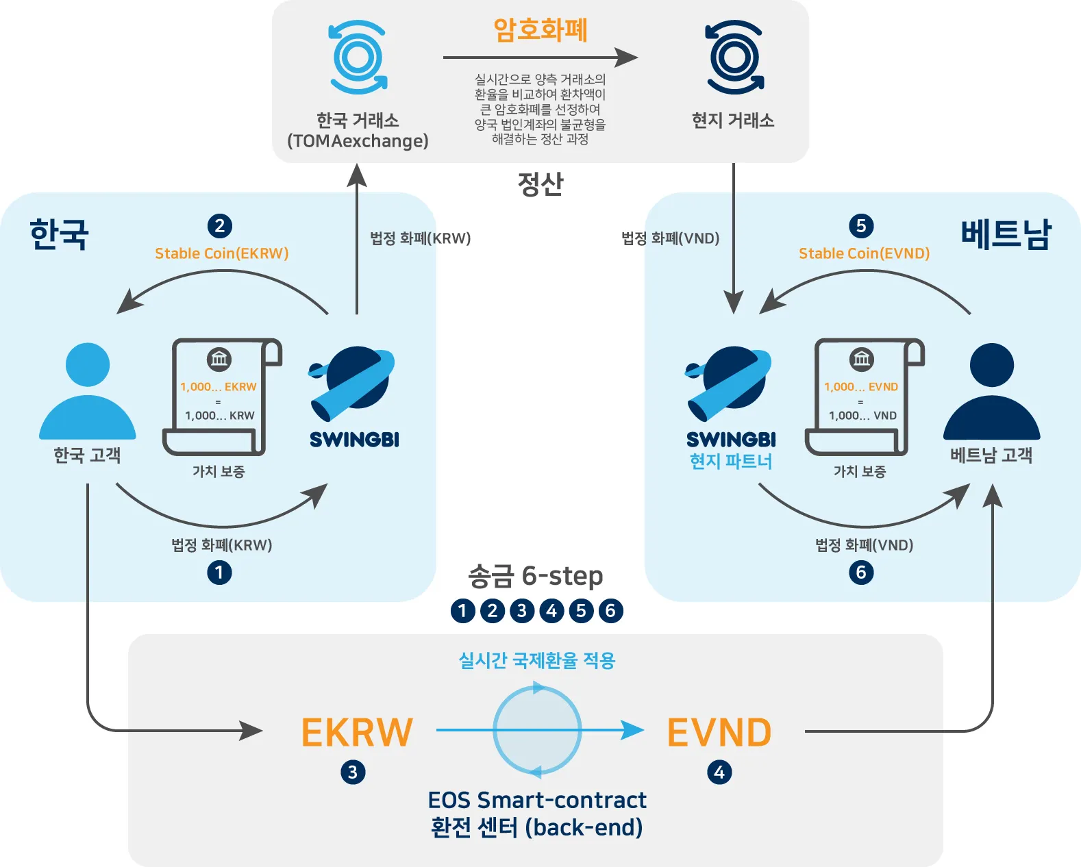스윙비는 암호화폐를 매개로 해외송금을 저렴하고 빠르게 바꿔주는 서비스입니다. 기존 국제 은행간 스위프트망으로 전송하는 해외송금의 속도와 수수료를 해결하고자 했습니다. 송금 프로세스는 다음과 같이 이루어집니다.