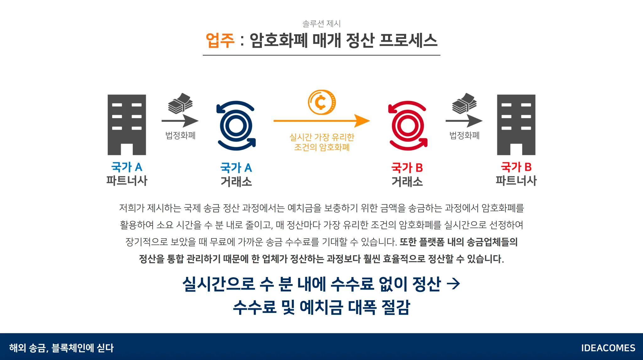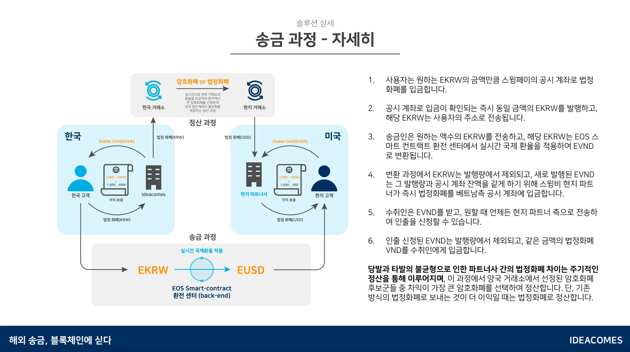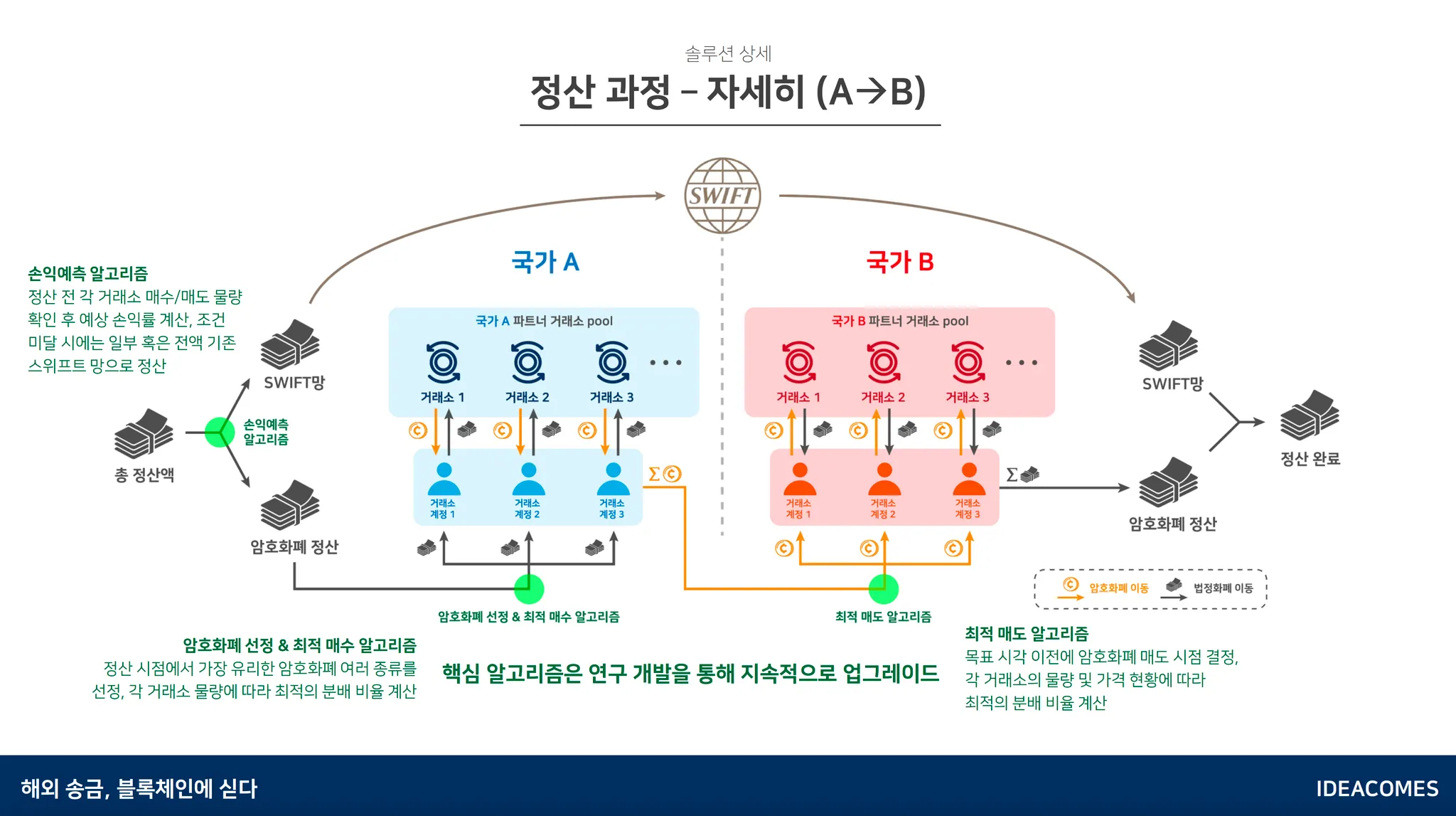 각국의 거래소들과 협약을 맺은 뒤, 법정화폐를 암호화폐로 환전 후 전송, 다시 상대 국가에서 법정화폐로 환전하는 방식입니다.
