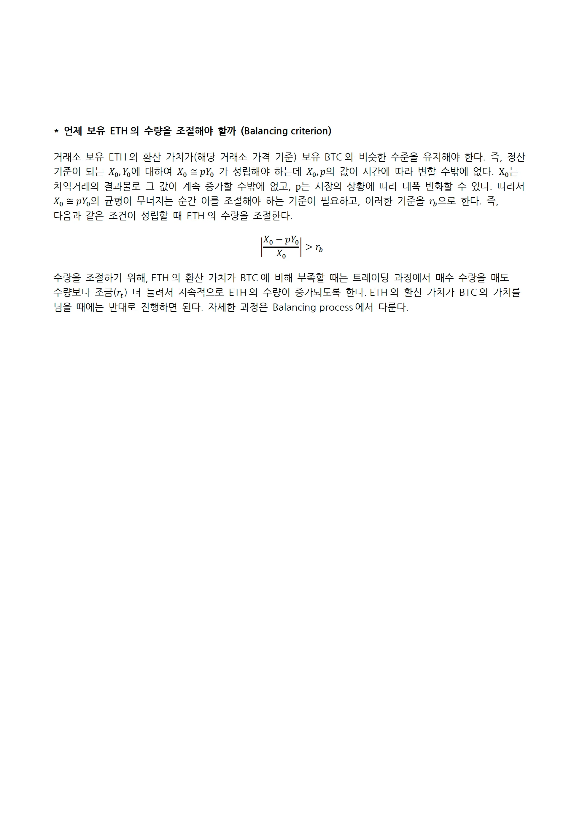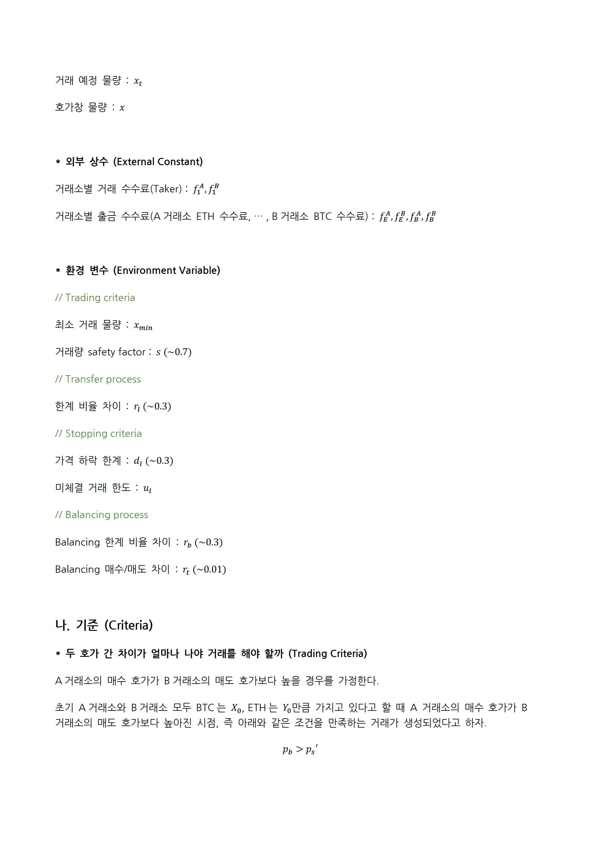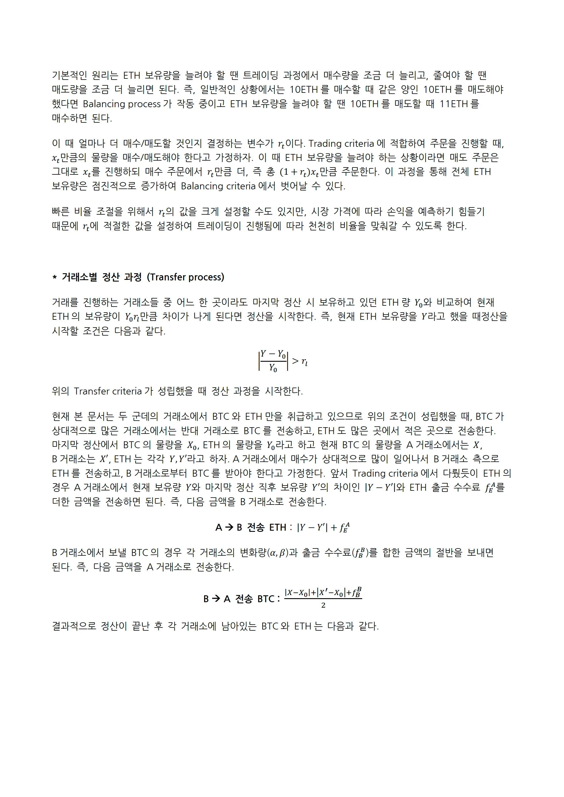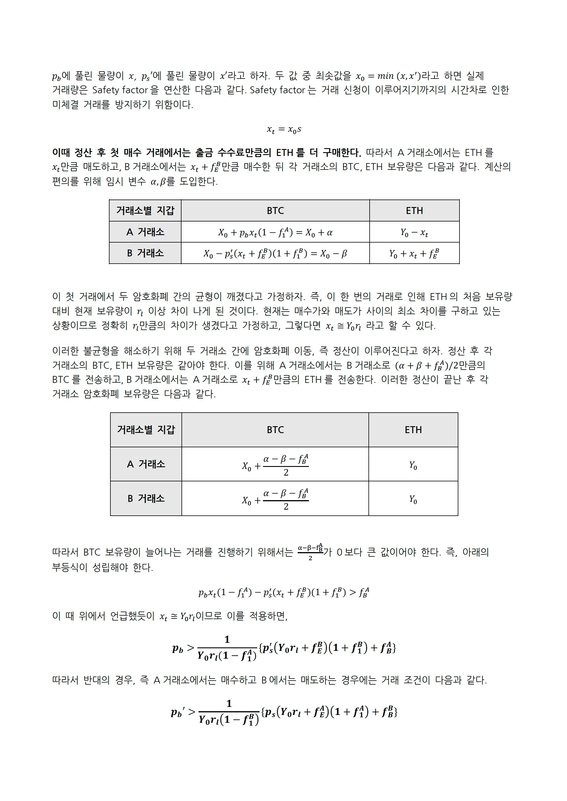지정된 2개 이상의 암호화폐 거래소에서, 무위험으로 BTC 물량을 늘려가는 로직을 작성. 각 거래소의 수수료를 고려하여 언제 거래를 진행해야 하는지, 그리고 이때 수익은 얼마나 발생하는지를 수학적으로 분석했다. 이후 Node.js Express 서버와 암호화폐 라이브러리 ccxt를 활용하여 실제 코드로 작성, 거래 criteria를 만족하는 경우가 얼마나 빈번하게 발생하는지 실험을 진행했다.