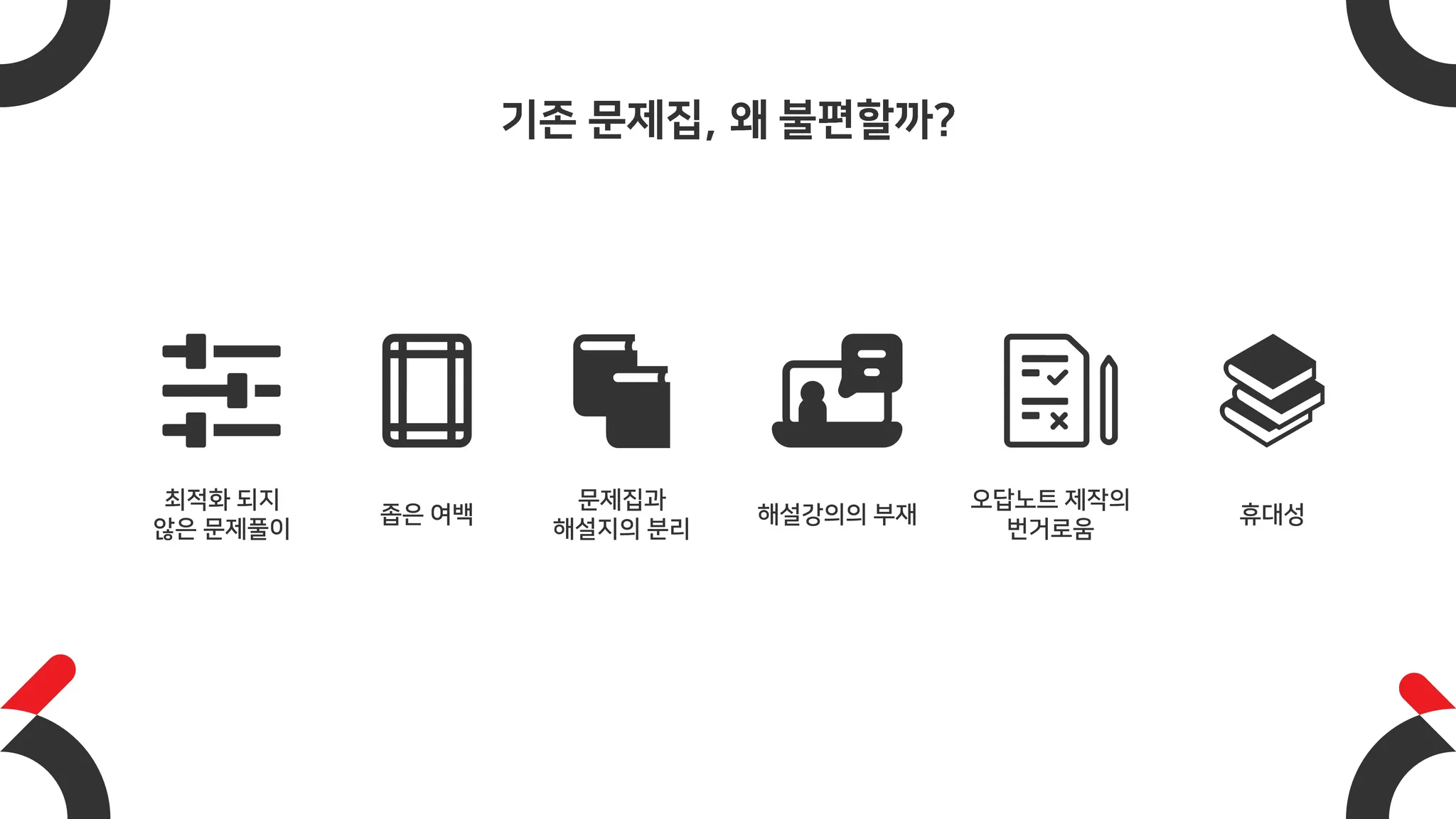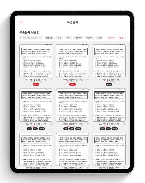 기존 종이문제집은 여러가지 불편함들이 있고, 이를 해결하기 위해 태블릿PC 내에서 자동 채점 및 오답노트 기능, 플래너 기능들을 제공해주고 있습니다.