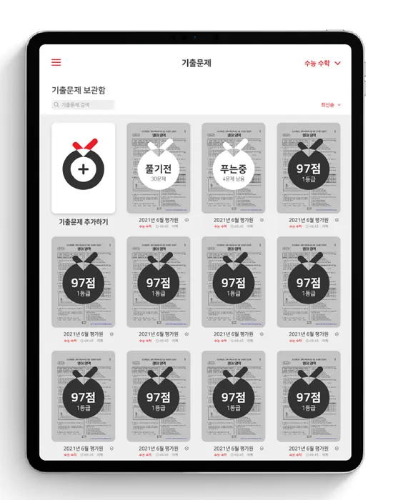 현재는 다양한 기출문제 (평가원, 교육청, 전기기사, 공인중개사 등) 를 제공하고 있으며, 추후 다양한 시중 문제집들과 제휴 예정에 있습니다.