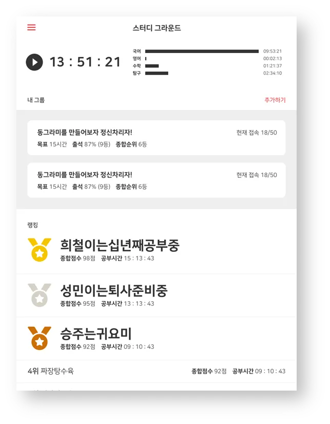 그룹을 만들거나, 그룹에 참여해서 실시간으로 그룹원들과 공부 상태를 공유할 수 있고 같은 공부를 하는 친구들과 순위 경쟁을 할 수도 있습니다.