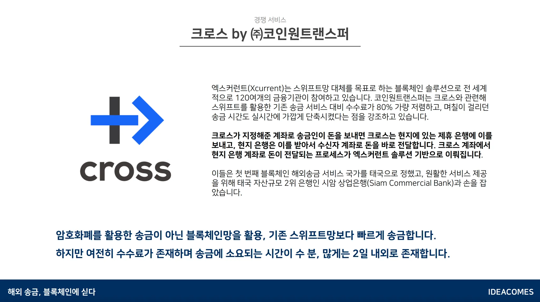 각국의 거래소들과 협약을 맺은 뒤, 법정화폐를 암호화폐로 환전 후 전송, 다시 상대 국가에서 법정화폐로 환전하는 방식입니다.