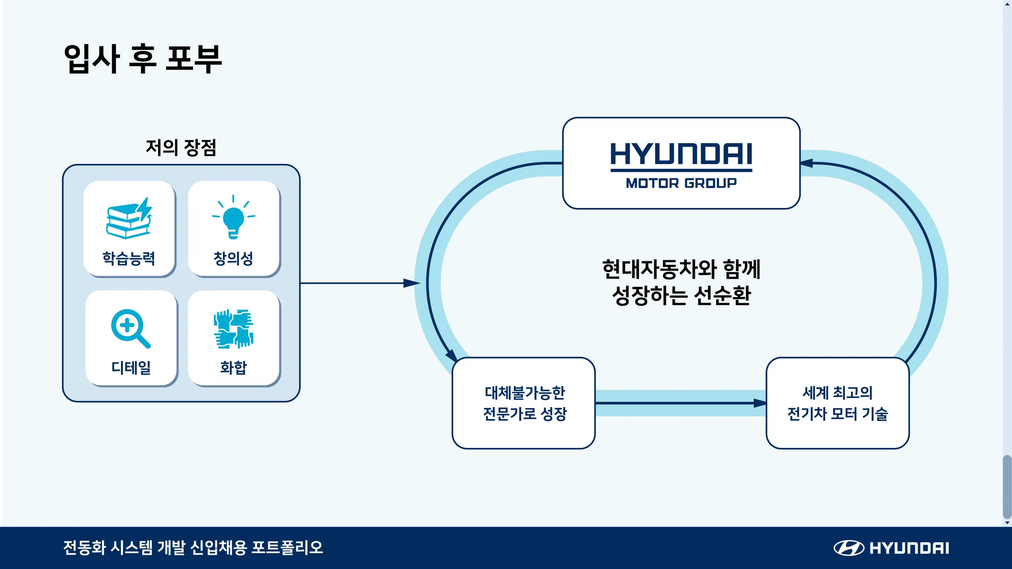 저는 만약 합격하여 현대자동차에서 근무하게 된다면, 앞서 말씀드린 제 장점들과 현대자동차가 제공하는 우수한 연구 장비와 연구 인력들을 융합하여 대체불가능한 전동화 기술 전문가로 성장하고 싶습니다. 이를 통해 세계 최고의 친환경차 파워트레인 기술을 만들어내고, 이는 또 현대자동차를 성장시킴으로써 회사와 함께 성장하는 선순환을 만들어내는 것이 제 포부입니다.