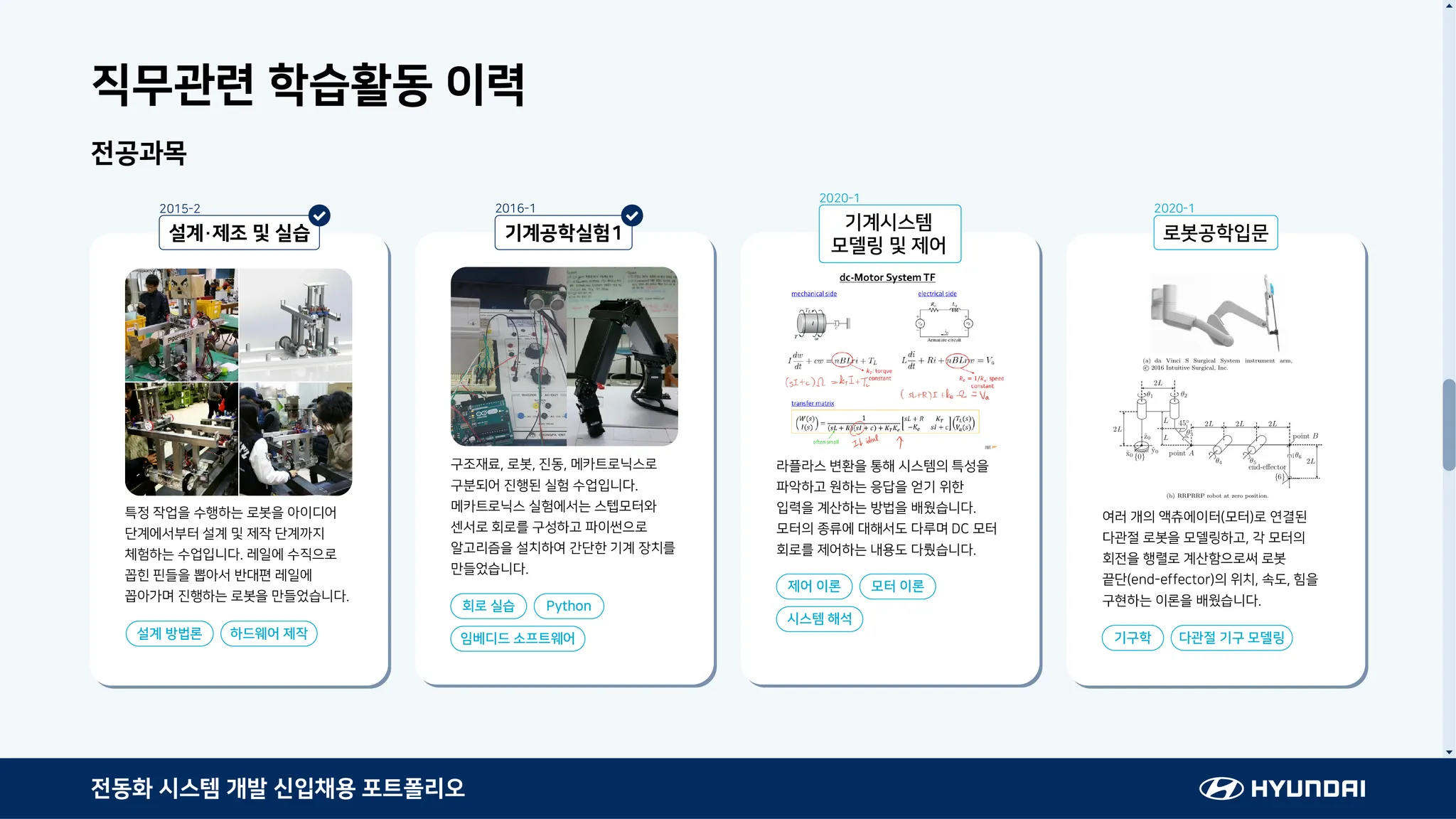 이번에는 직무관련 학습활동 이력을 말씀드리겠습니다. 전공과목들을 통해서 저는 제어를 포함한 기계 전반에 대한 지식을 쌓을 수 있었습니다.