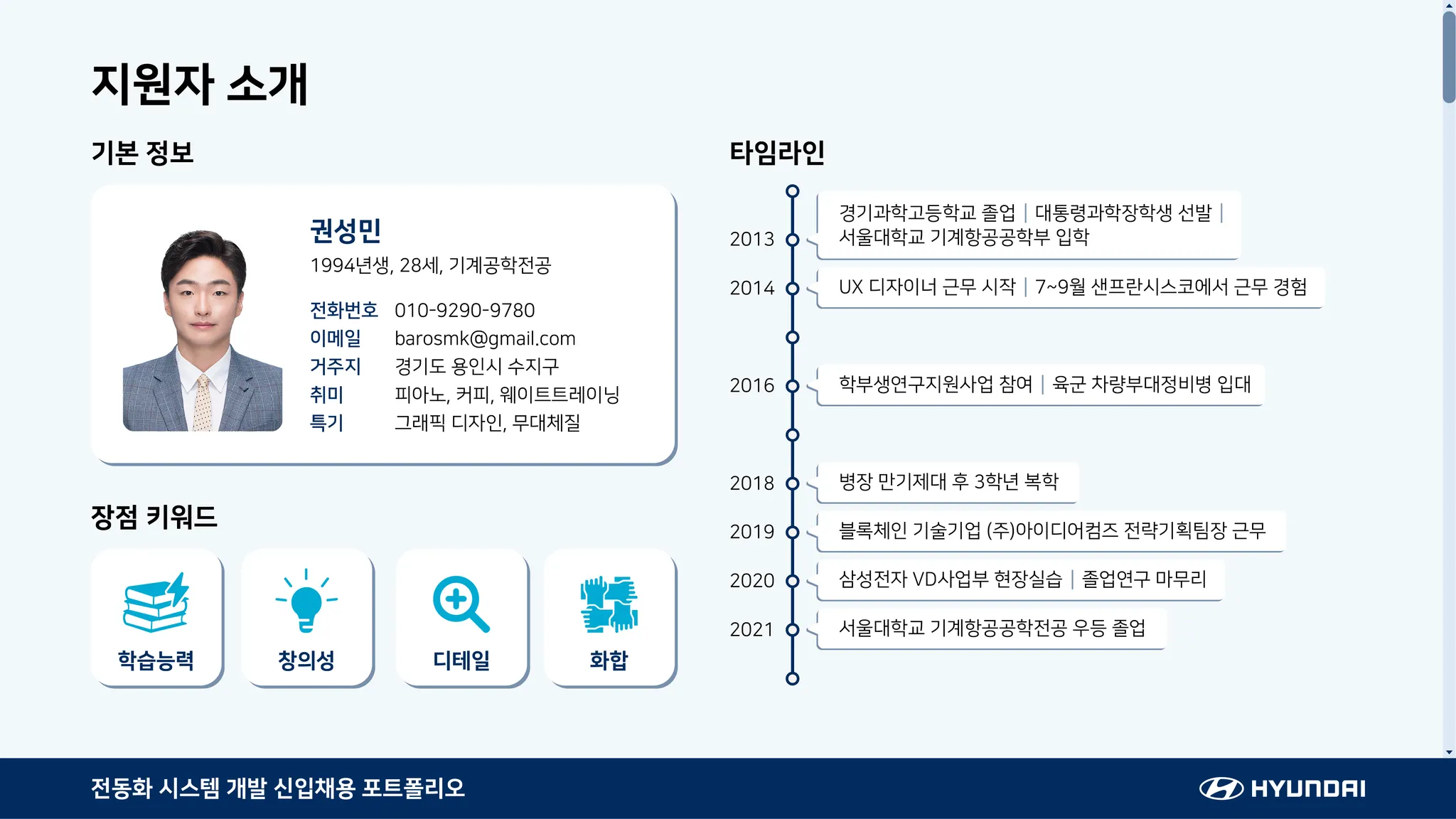 안녕하십니까. 저는 이번 현대자동차 연구개발본부 전동화 시스템 개발 직무에 지원한 권성민입니다.