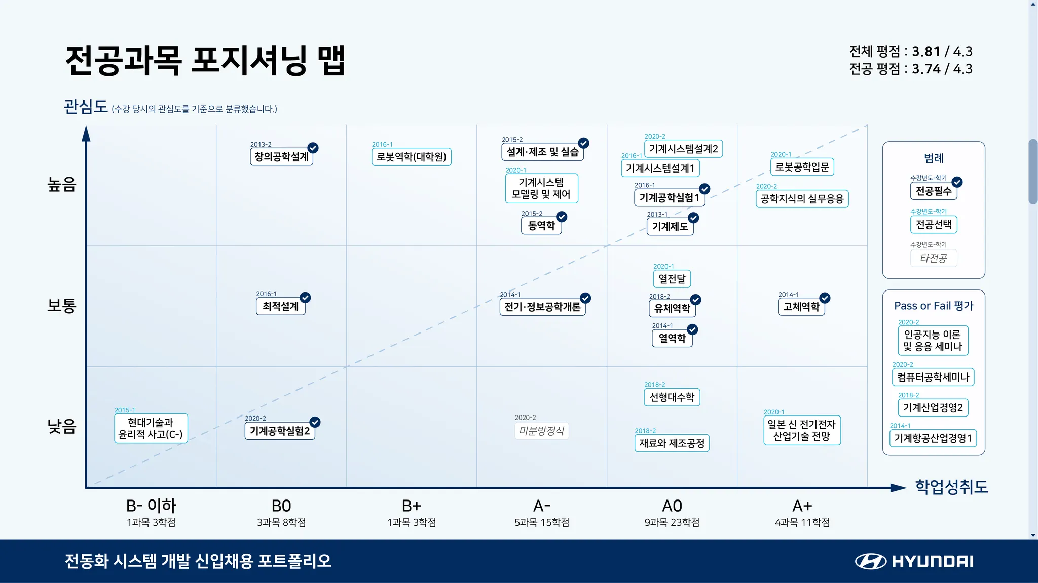 다음은 제 학부시절 전공과목 포지셔닝 맵에 대해서 말씀드리겠습니다. 체크 표시된 것이 전공필수 과목이고 이수 학기는 좌상단에 조그맣게 기재되어 있습니다.