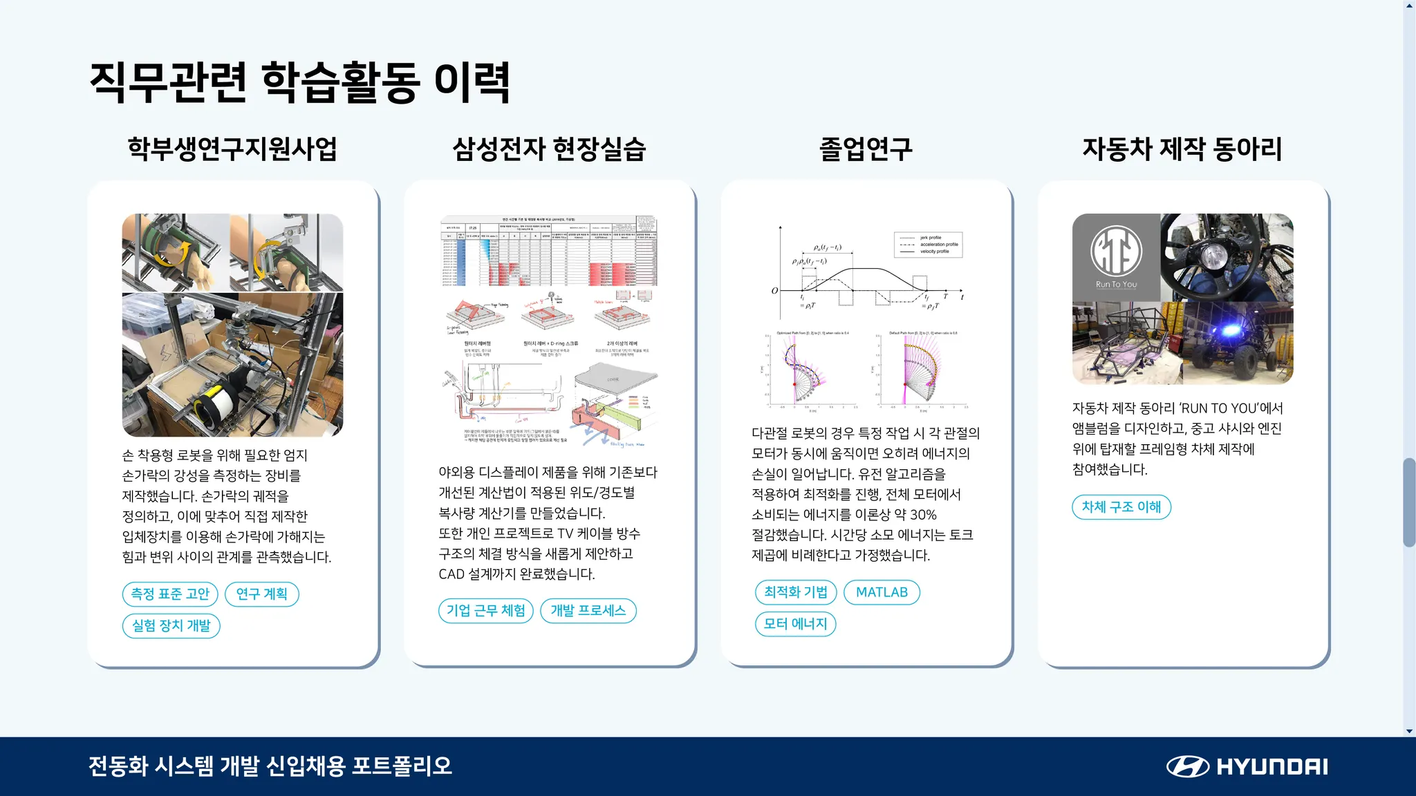그리고 직무 관련 4가지 활동들에 대해 말씀드리겠습니다. 4가지 활동을 통해 저는 연구와 기업생활, 그리고 차량 실습을 골고루 경험할 수 있었습니다.