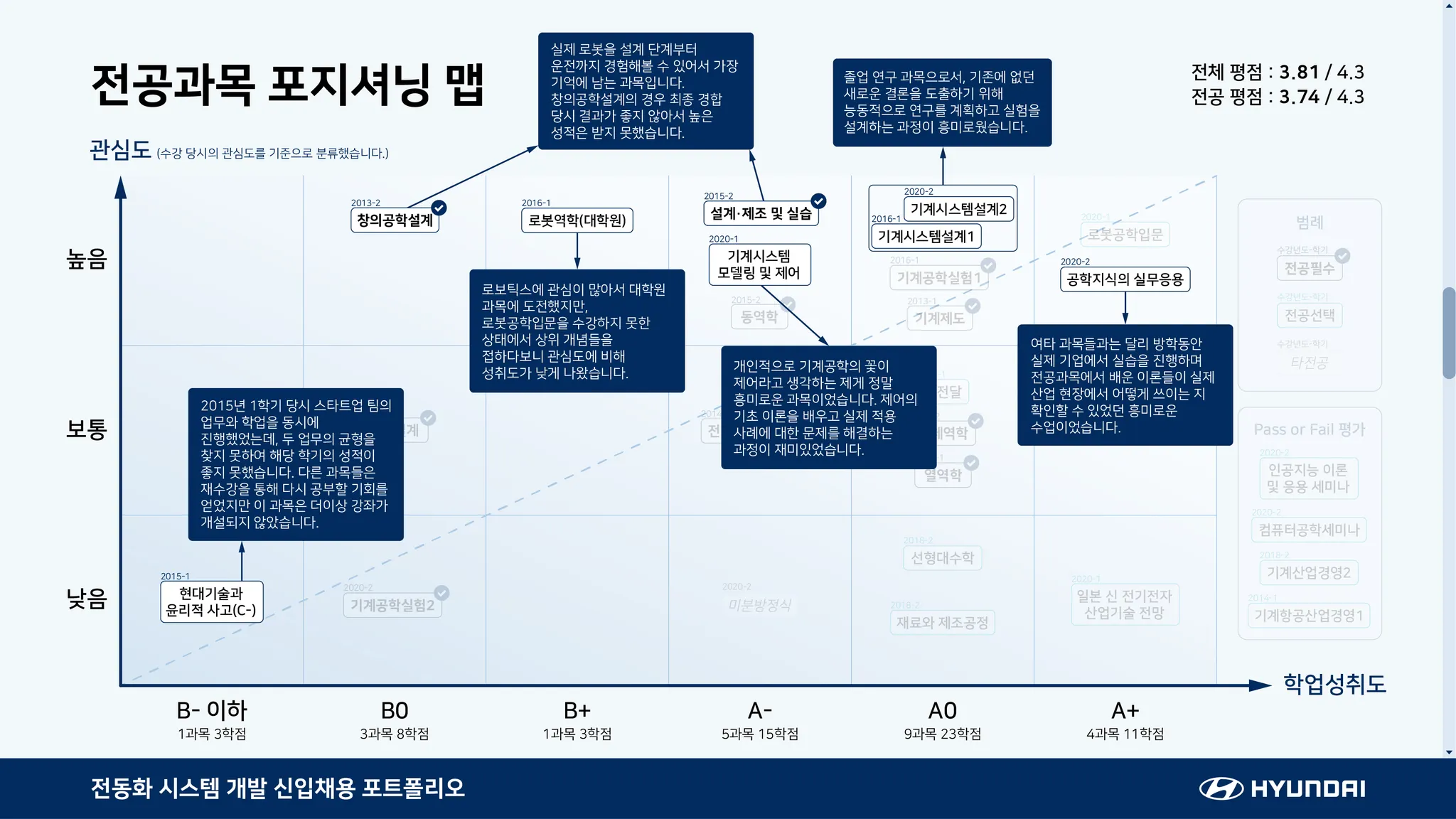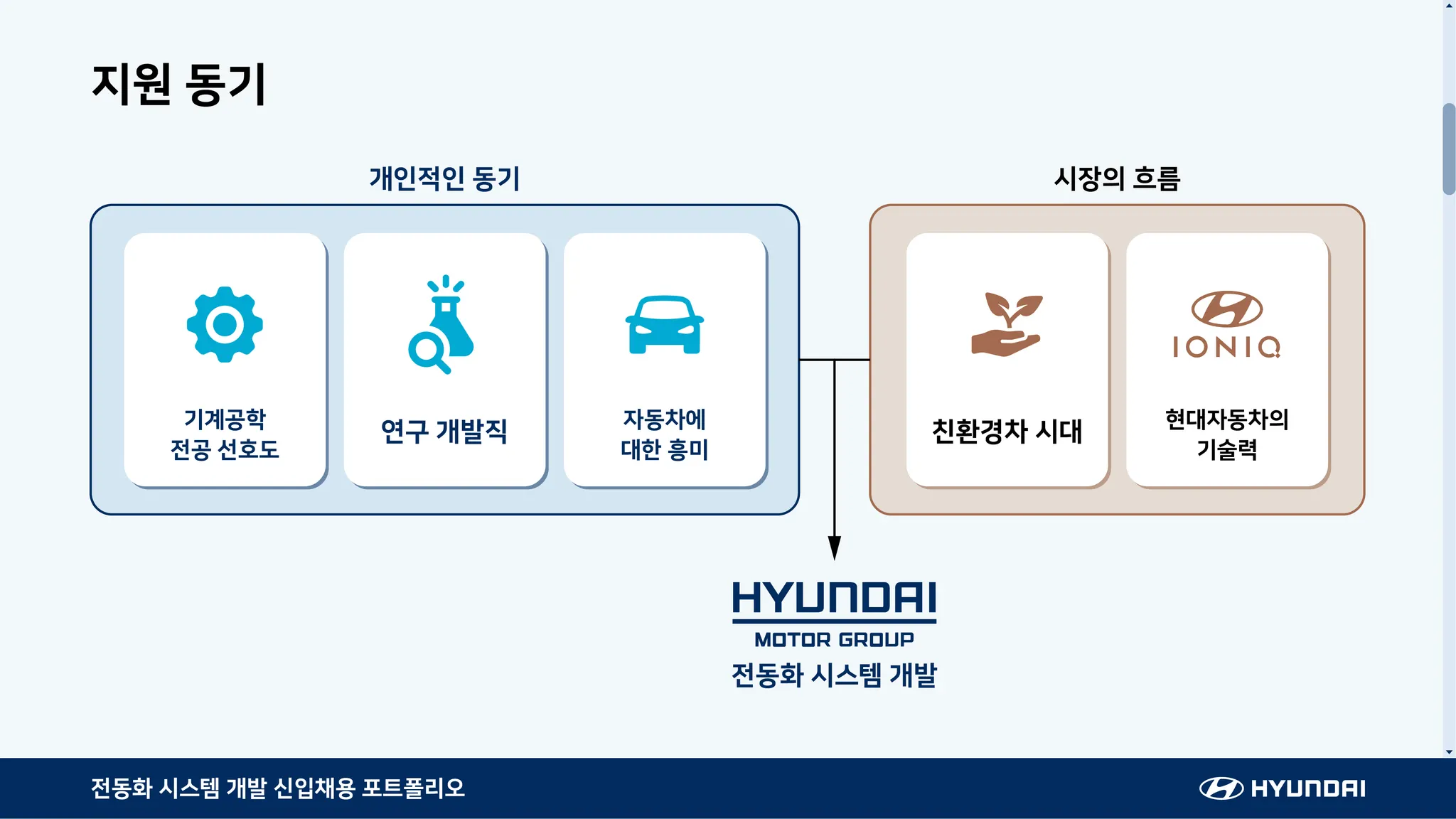 거기에 수소차 기술은 세계 10대 엔진에 선정될 정도로 세계 제일 수준이어서, 현대자동차 전동화 시스템 개발 직무에서 꼭 일해보고 싶다는 생각을 하게 되었고 이번 채용에 지원하게 되었습니다.