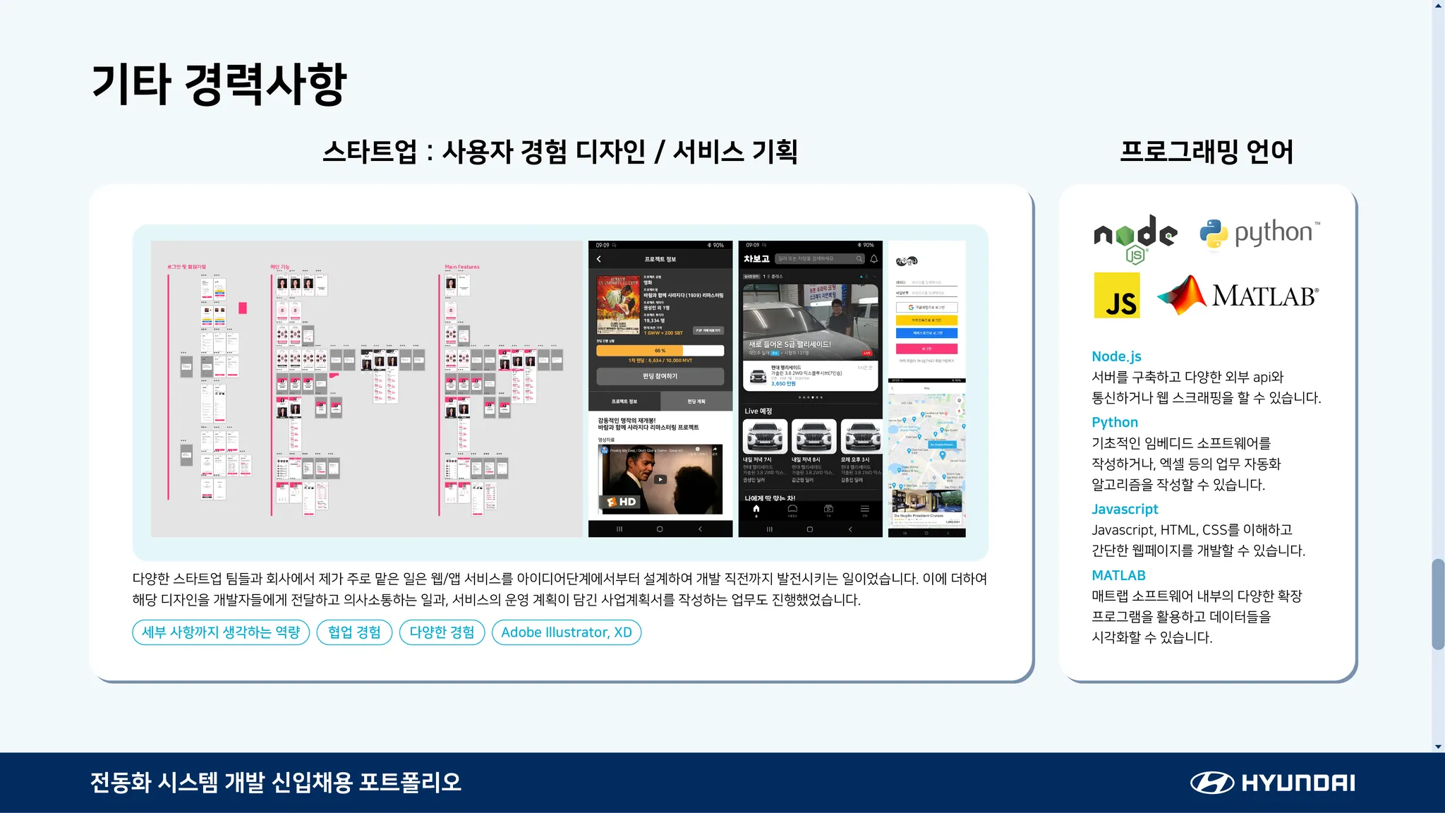 추가로 스타트업에서 일한 경험에 대해 간략하게 언급해드리고 싶은데요, 스타트업 경험에서는 서비스 기획 역량과 협업 능력을 기를 수 있었습니다.